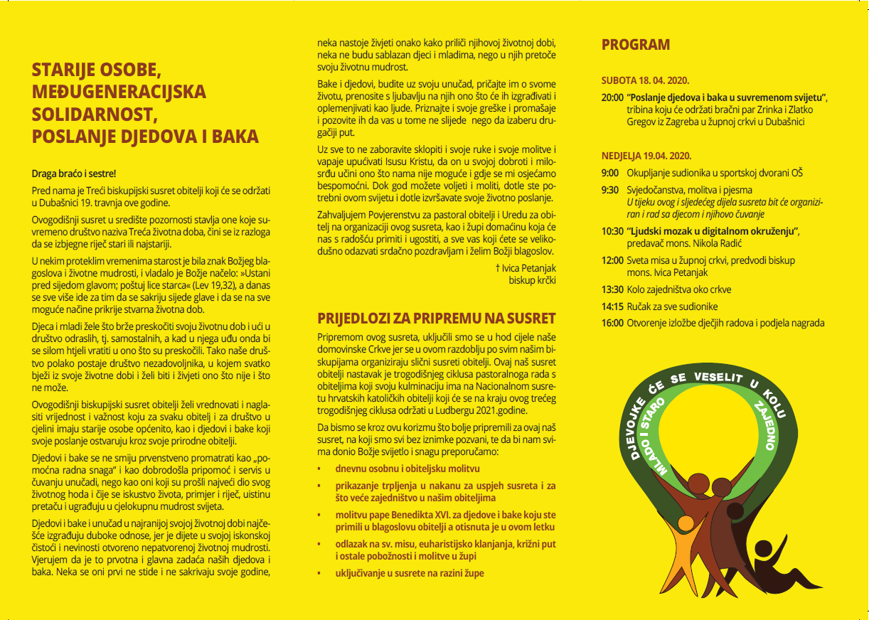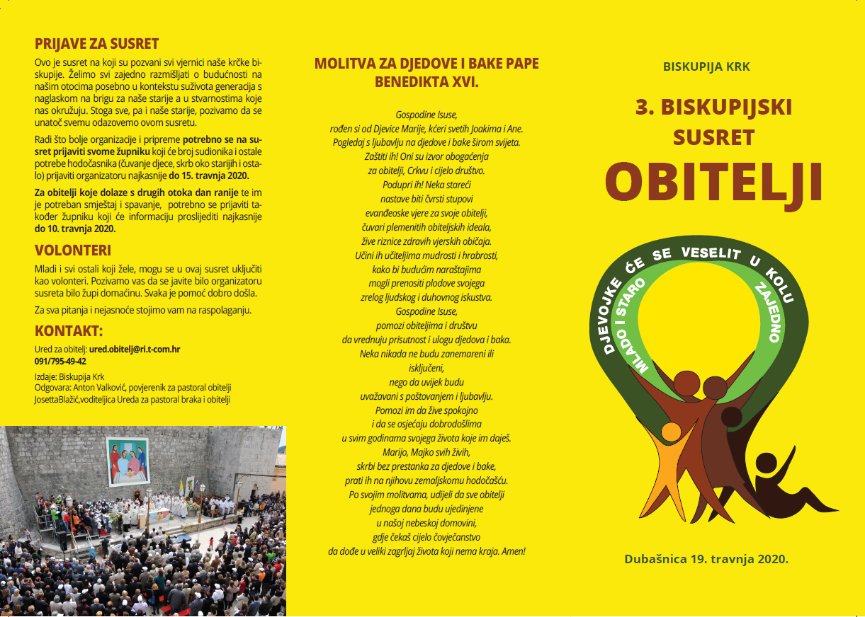 U Župi Malinska – Dubašnica održat će se u nedjelju 19. travnja 2020. godine Treći biskupijski susret obitelji. Uključujemo se tako u hod cijele naše domovinske Crkve jer se u ovom razdoblju po svim našim biskupijama organiziraju slični susreti obitelji.Ovaj naš susret obitelji nastavak je je trogodišnjeg ciklusa pastoralnoga rada s obiteljima koji svoju kulminaciju ima na Nacionalnom susretu hrvatskih katoličkih obitelji koji će na kraju ovog trećeg trogodišnjeg ciklusa biti u Ludbregu 2021. godine.