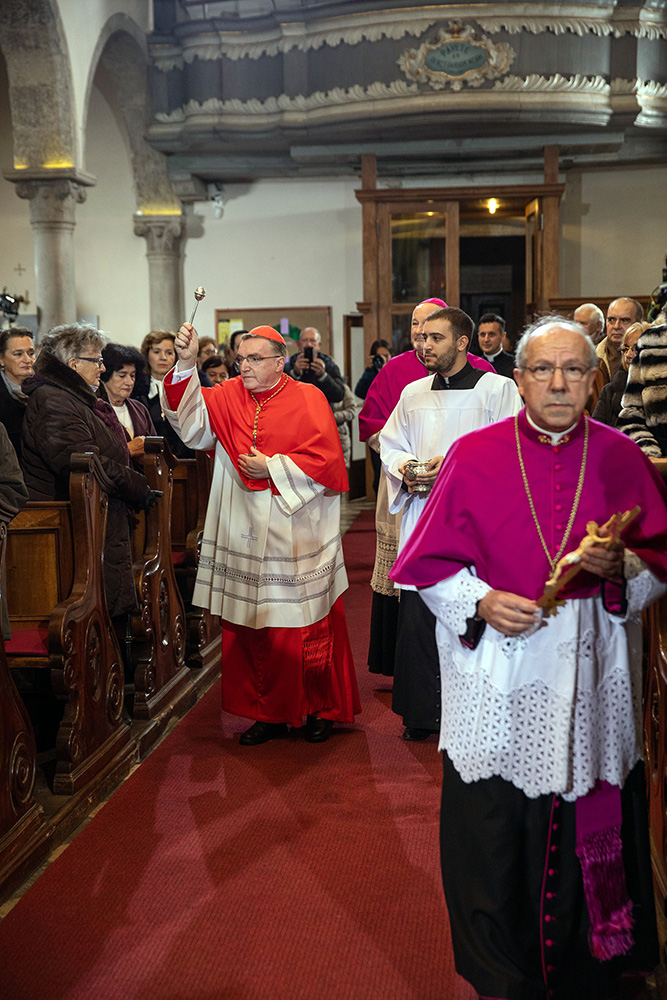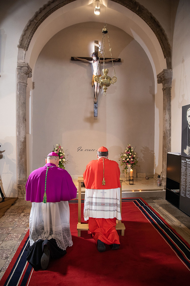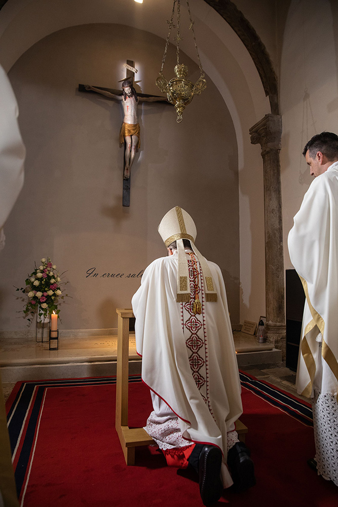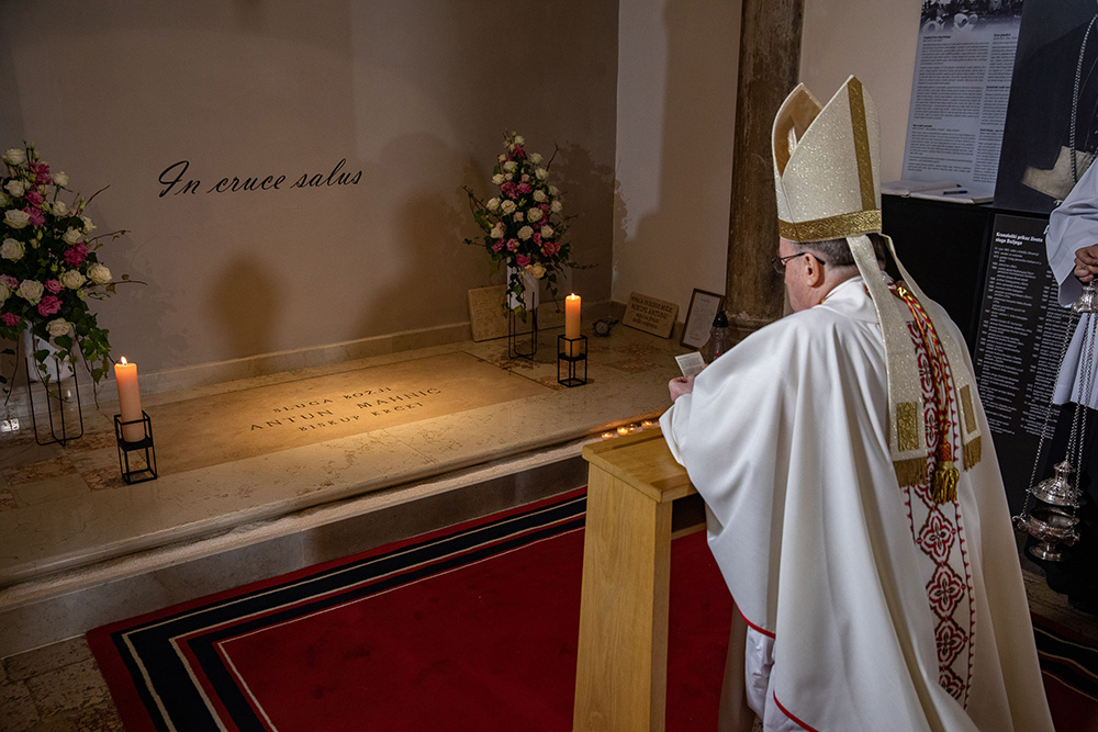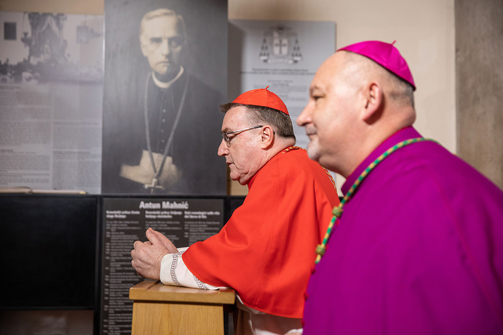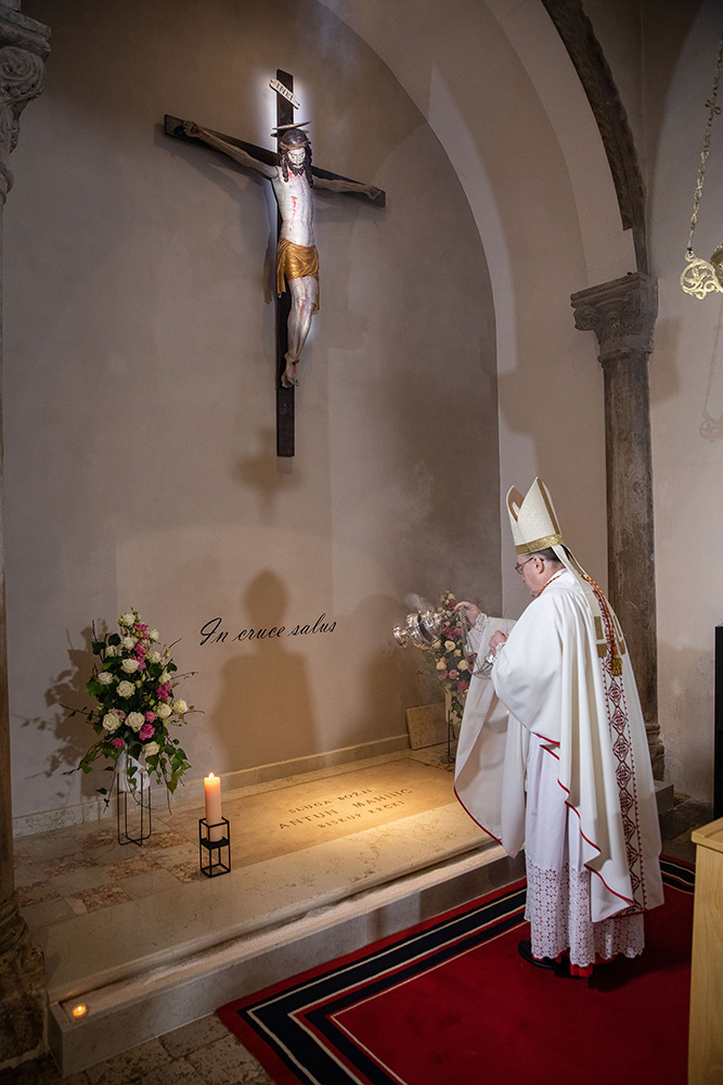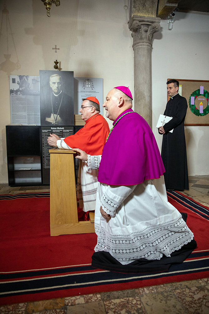 Na ulazu u krčku katedralu, zagrebački se nadbiskup, praćen domaćim biskupom mons. Ivicom Petanjkom i postulatorom Mahnićeve kauze vlč. Sašom Ilijićem zadržao u molitvi na grobu sluge Božjega.