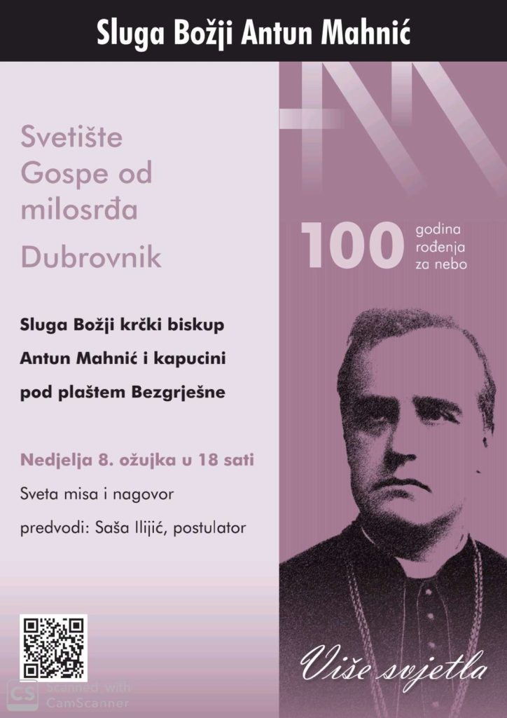 U biskupijskom svetištu Gospe od milosrđa u Dubrovniku u nedjelju 8. ožujka organizirana je večer sluge Božjega biskupa Antuna Mahnića. Misu je predvodio postulator vlč. Saša Ilijić u koncelebraciji s gvardijanom i rektorom svetišta fra Stankom Dodigom i fra Tomom Ivankom. U propovijedi postulator je okupljenoj zajednici govorio o pozivu na svetost koja nije rezervirana za pojedince već za svakoga vjernika. „U Isusovom preobraženju o kojem smo slušali u nedjeljnom Evanđelju očituje se milosrđe i ljubav Oca nebeskoga koji svakoga od nas želi preobraziti. To nam treba biti i zajednički poziv ove korizme, da se kroz molitvu, pokoru i djela milosrđa iz dana u dana preobražujemo te postanemo više Božji“, pojasnio je. Postulator je predstavio svetački lik sluge Božjega: „U godini kada obilježavamo 100. obljetnicu rođenja za nebo biskupa Antuna Mahnića želja nam je da se u hrvatskom narodu vjernici upoznaju sa čovjekom koji je u određenom trenutku naše povijesti svojim predanjem u ruke Gospodinove radio na navještaju Kraljevstva nebeskoga te poticao svakoga čovjeka da ugradi Evanđelje kao temeljno načelo života“. Istaknuo je posebnu vezu između sluge Božjega i franjevaca kapucina koji su udruženim snagama svoje živote stavili u izgradnju Kraljevstva nebeskoga, te njihovu osobnu pobožnost prema Bezgrešnoj Djevici Mariji.