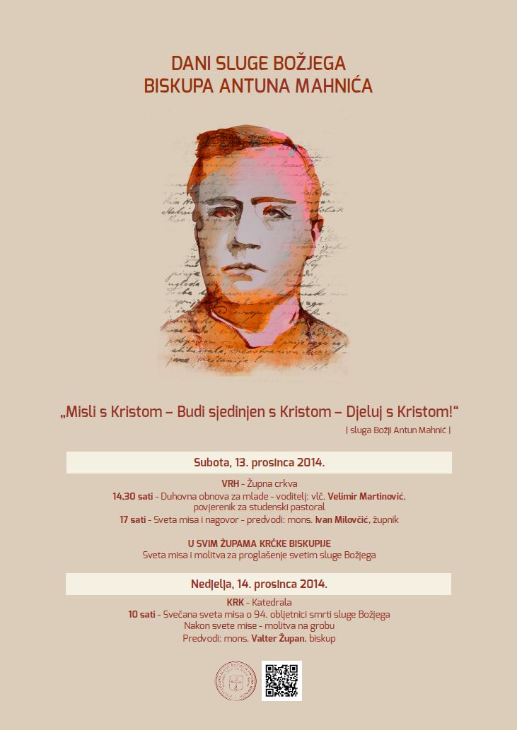 Budući da se dan smrti sluge Božjega ove godine poklapa s Nedjeljom Caritasa, obilježavanje je započelo dan ranije, u subotu 13. prosinca, duhovnom obnovom za mlade koju je u župi Vrh predvodio vlč. Velimir Martinović, povjerenik za pastoral mladih riječke nadbiskupije. Okupilo se 40-ak mladih iz župa otoka Krka i župe Cres. Vlč. Velimir progovorio je mladima o vizijama i mislima sluge Božjega u kojima poziva mlade na razvijanje međusobnog jedinstva u slozi i aktivnom zauzimanju za Crkvu te djelovanju u povezanosti unutar iste koja je naša zajednička Majka. Da bi mladi vjernik to mogao postići, ističe vlč. Martinović, potrebno je da raste u ljubavi prema Bogu, bližnjemu i samome sebi. Prepoznajući Boga kao milosnog oca koji ljubeći želi dobro svakoj osobi, moći će razvijati djelotvornu ljubav prema bližnjima. Cijeneći sebe i svoje talente podarene od Boga, ne prepuštajući se nametnutim idejama o čovjeku kakav bi trebao biti a koje dolaze iz medija, mlada će osoba biti oslobođena svake zapreke da bude slobodna, da ljubi i da djeluje, kazao je vlč. Martinović. Upravo je ta otvorenost Bogu i ljubav prema Njemu i prema čovjeka bila snaga djelovanja biskupa Mahnića. A ta snaga je bila toliko jaka da je svojim životom bio magnet koji je privlačio tolike mlade da se usmjere prema Bogu. Nakon ovog izlaganja uslijedile su radionice u kojima su mladi zajedno razmišljali o sebi samima pred Bogom i njegovim zapovijedima ljubavi.
