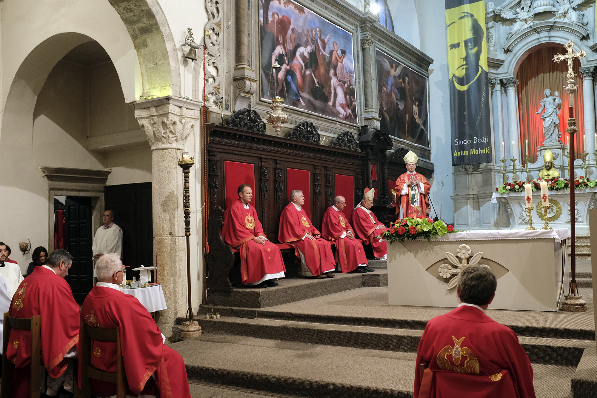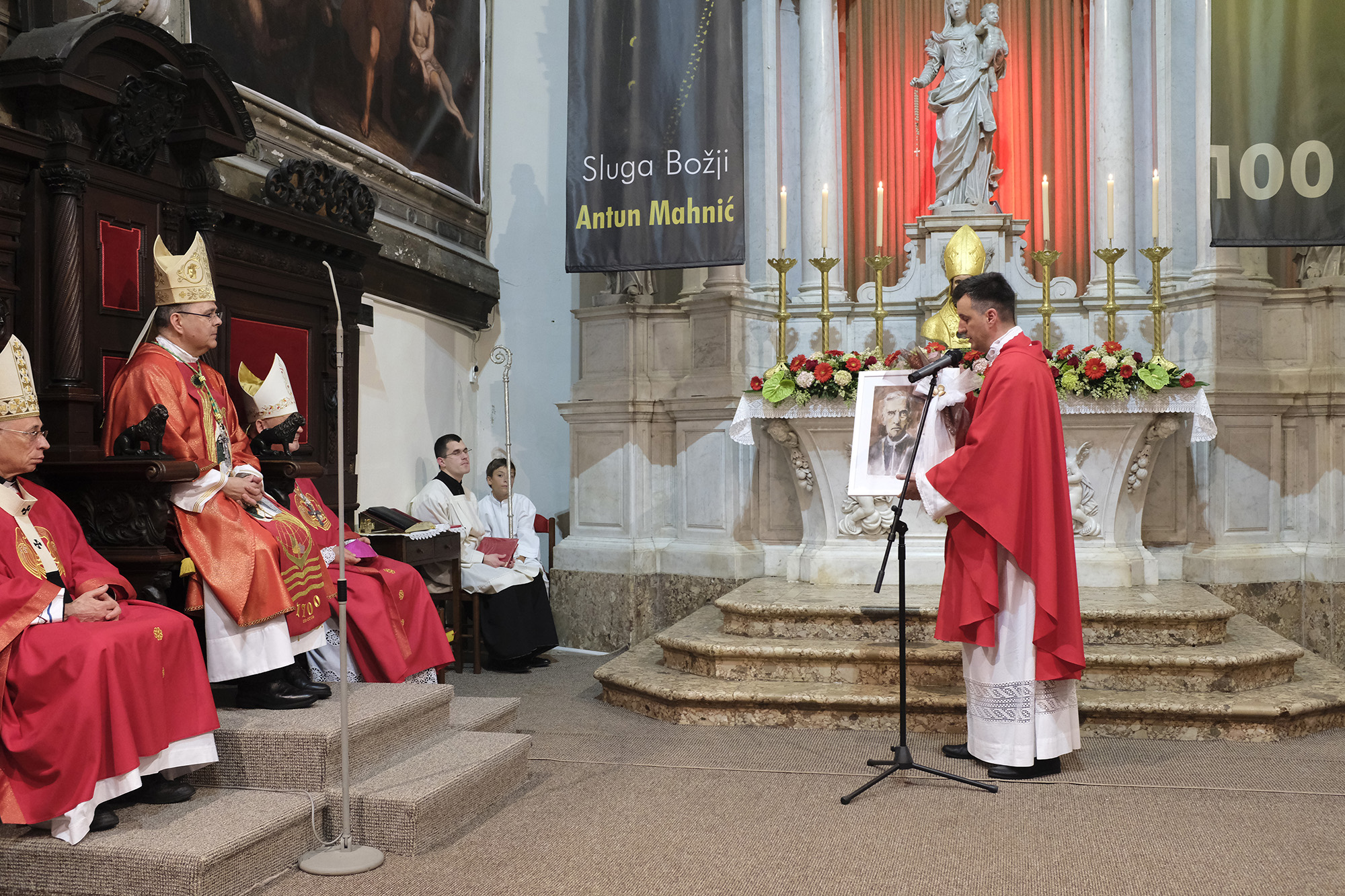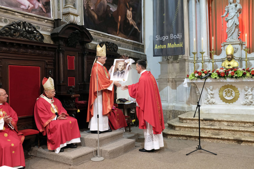 Nakon popričesne molitve mons. Radoša pozdravio je vlč. Saša Ilijić, postulator. Izrazio je radost što je mons. Radoš kao predvoditelj slavlja, u ovoj godini 100. obljetnice rođenja za nebo Sluge Božjega, ujedno i hodočasnik varaždinske Crkve u katedralu u kojoj je grob Sluge Božjega, koji je s ovog istog mjesta tražio i zazivao zagovor svetog mučenika – biskupa Kvirina. Zaželio je da mu biskup Mahnić izmoli jasna kršćanska načela koja će ga voditi u njegovom životu i biskupskoj službi. Pozvao ga je također da sa svojim svećenicima i vjernicima varaždinske biskupije hodočasti na grob Sluge Božjega. Vlč. Ilijić uručio je zatim mons. Radošu portret biskupa Mahnića, rad akademske slikarice Eve Vukine, upravo iz Varaždinske biskupije.