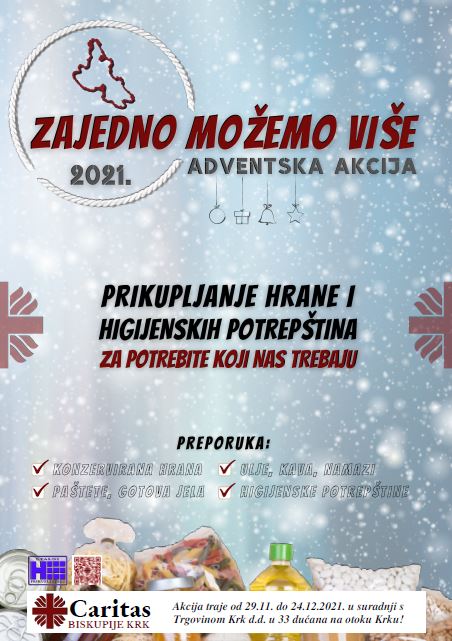 Adventska akcija „Zajedno možemo više“, u organizaciji Caritasa Biskupije Krk, provodi se i ovoga došašća u 33 poslovnice Trgovine Krk na otoku Krku. Kao i prethodnih godina ovo je akcija kojom je kupcima omogućeno da na izlasku iz dućana odlože kupljene proizvode (hrana i higijenske potrepštine) u za to predviđene košare/kutije. Prikupljeni proizvodi koristit će se u mreži Caritasa za podjelu krajnjim korisnicima koji žive u siromaštvu ili u riziku od siromaštva i socijalne isključenosti.