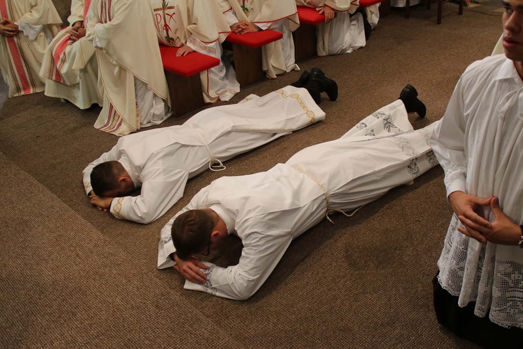 Nakon homilije uslijedio je sam obred ređenja: prihvaćanje službe ređenika, prostracija ređenika i molitva litanija svih svetih, polaganje ruku Biskupa i posvetne molitve. Novi đakoni zatim su obučeni u štolu i dalmatiku, a Biskup im je predao knjigu Evanđelja – tog znaka đakonskog služenja Riječi i naviještanja Radosne vijesti. Na kraju Biskup im je podijelio cjelov mira.