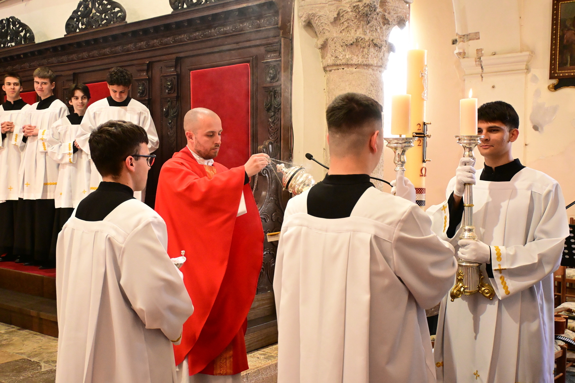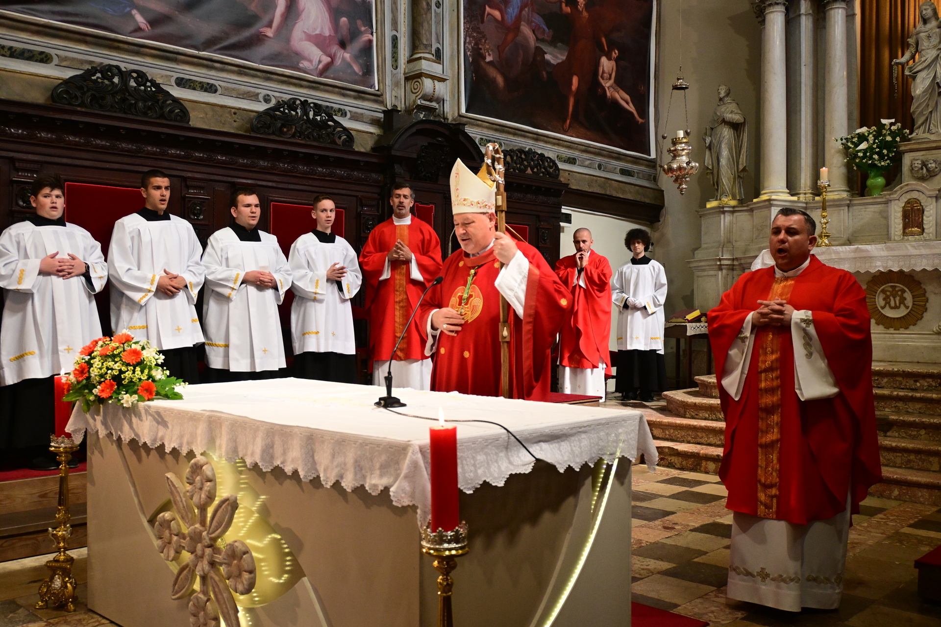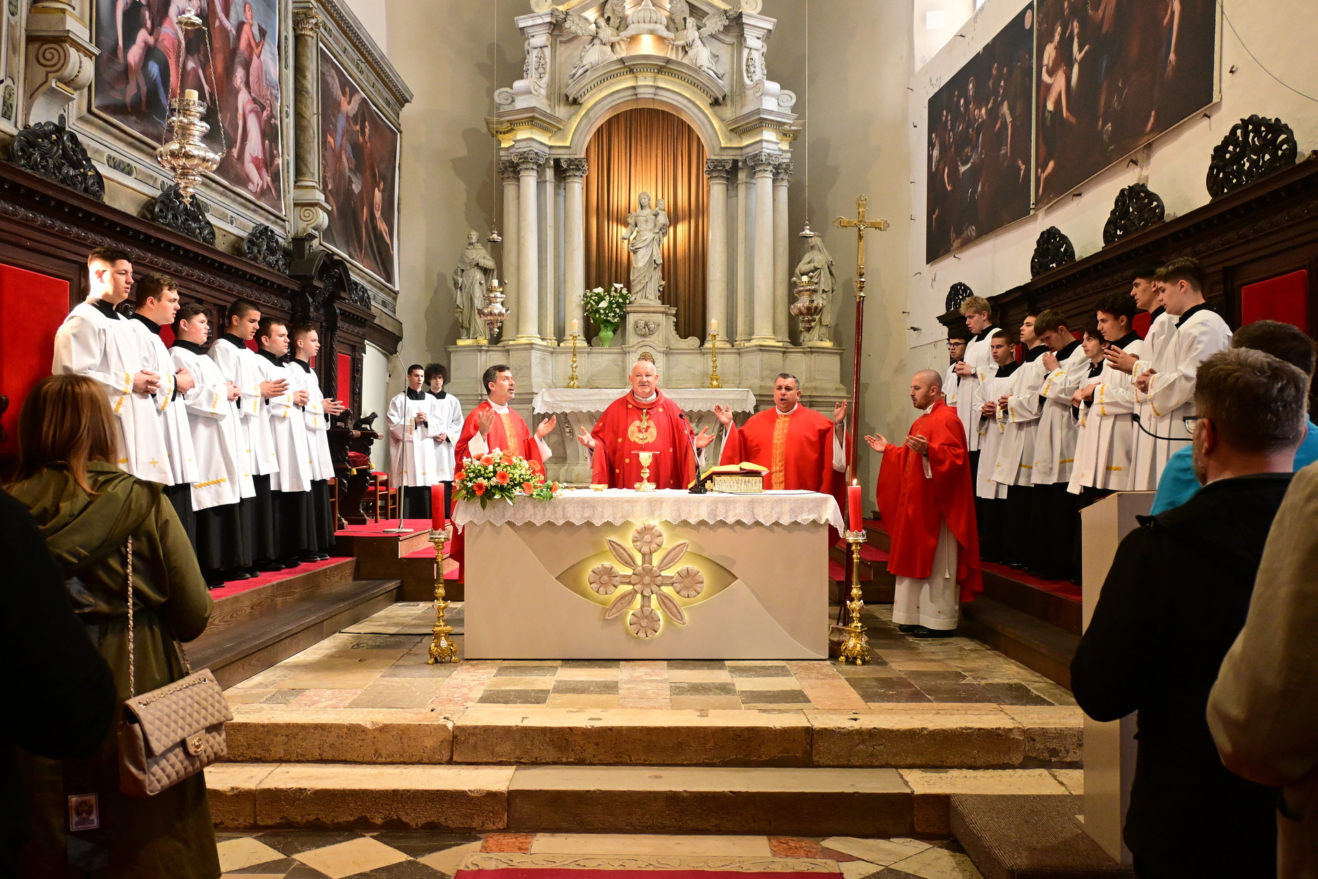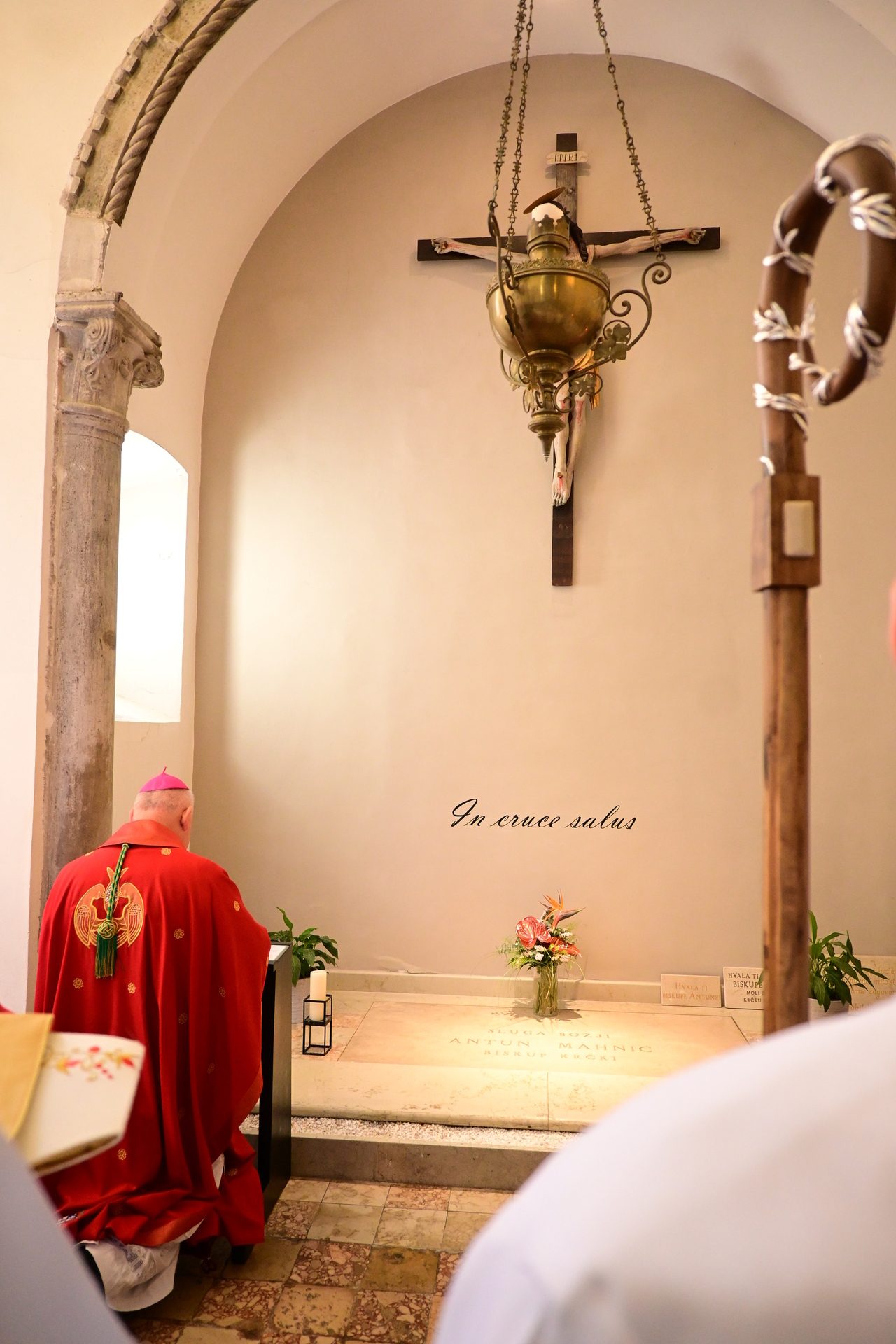 Poslije kratke okrjepe, s početkom u 10 sati, započelo je svečano pontifikalno misno slavlje u krčkoj prvostolnici koje je predvodio krčki biskup mons. Ivica Petanjak, u koncelebraciji sa rektorom preč. Matijom Pavlakovićem, duhovnikom sjemeništaraca vlč. Matkom Filipovićem i katedralnim župnikom don Vedranom Kirinčićem. Prigodnu homiliju unutar slavlja za okupljene hodočasnike izrekao je krčki biskup Petanjak, a nakon svete mise biskup je okupljene upoznao s bogatom poviješću grada Krka i same katedrale te je ukratko predstavio povjerenu mu biskupiju kojoj predsjeda u službi pastira. Nakon zajedničke molitve na grobu sluge Božjega biskupa Antuna Mahnića, hodočasnici su imali prigodu i za kratku okrjepu u prostorima biskupskog ordinarijata.