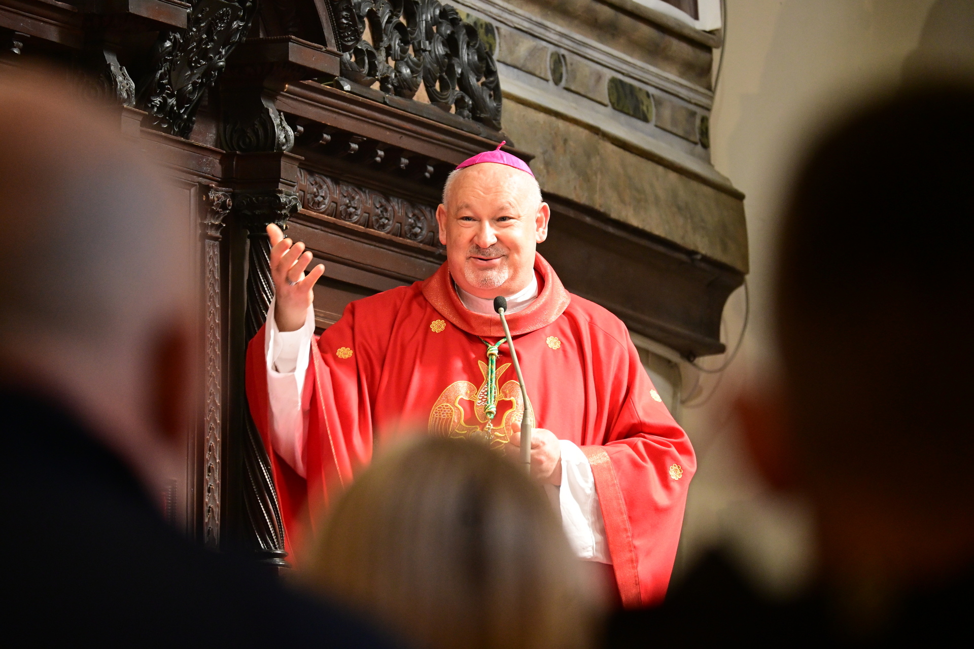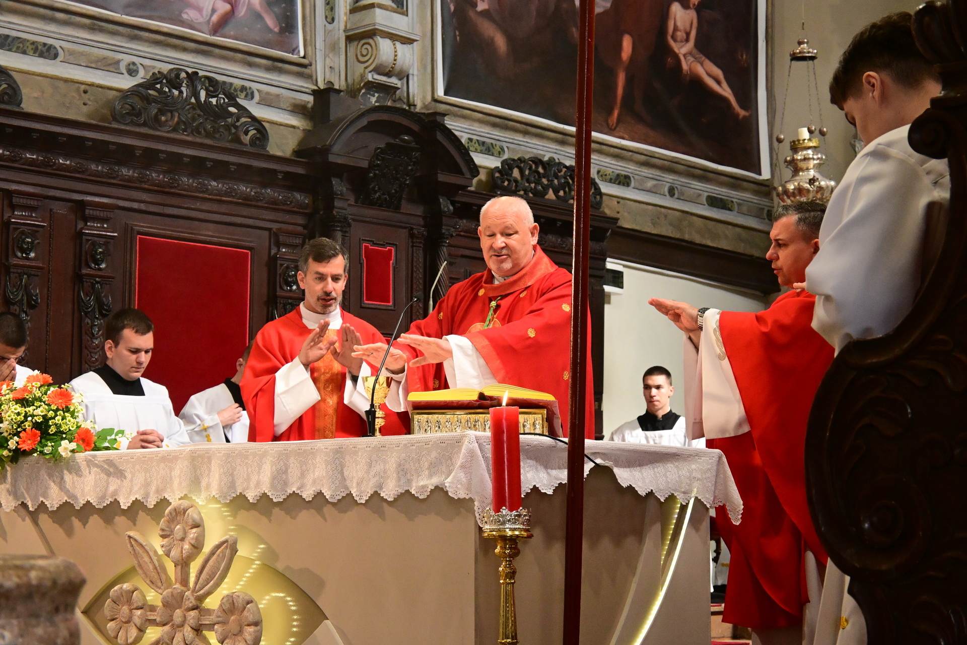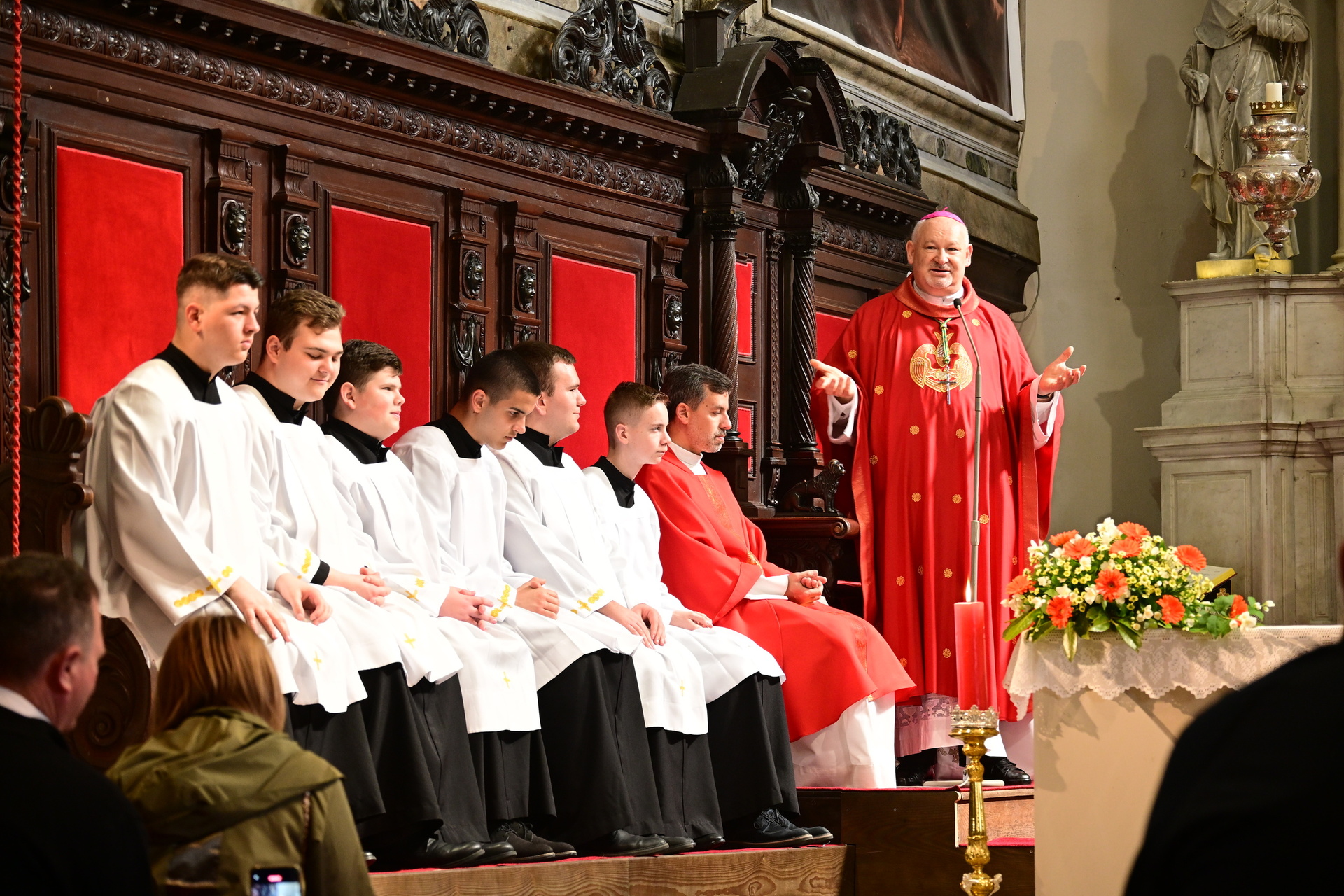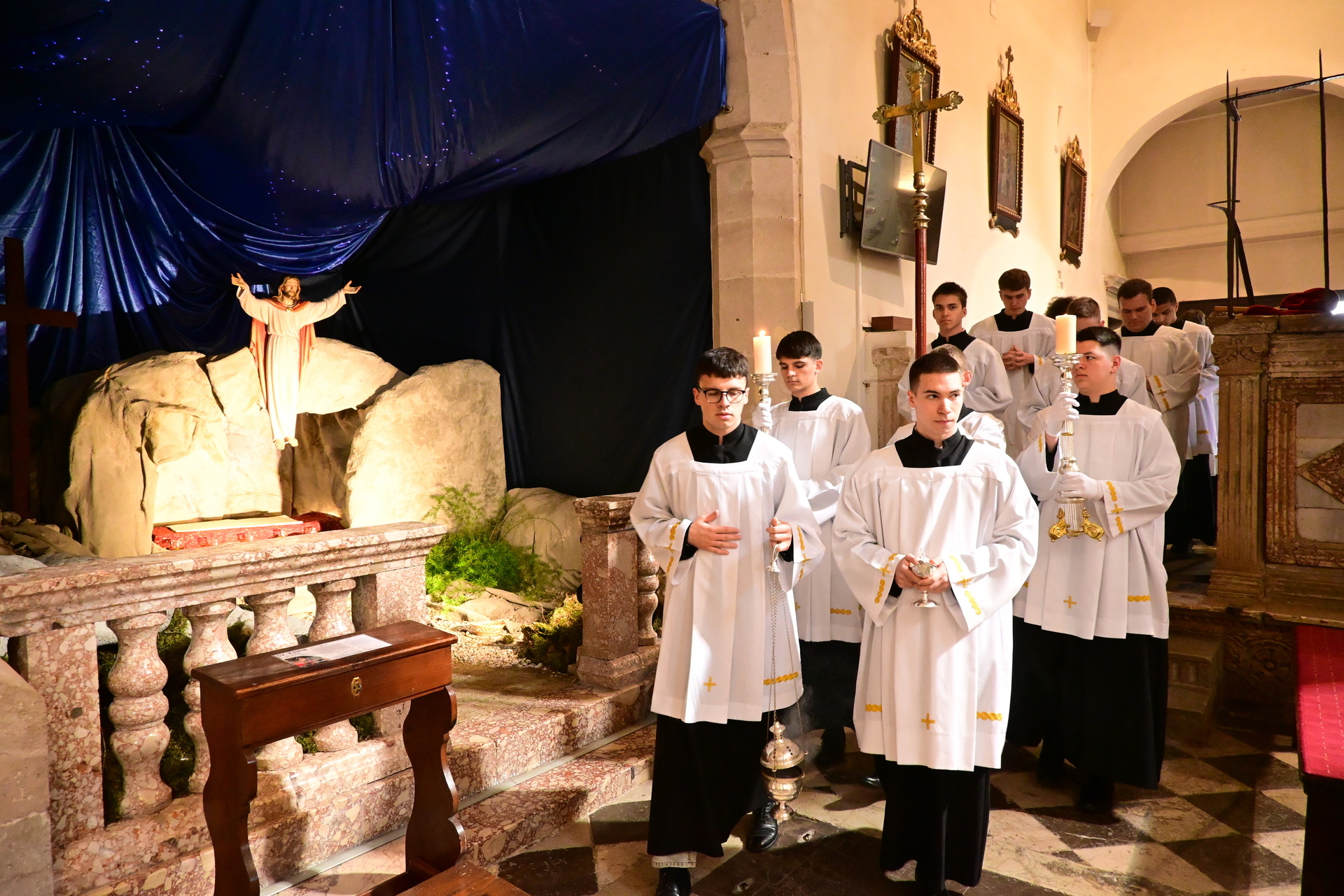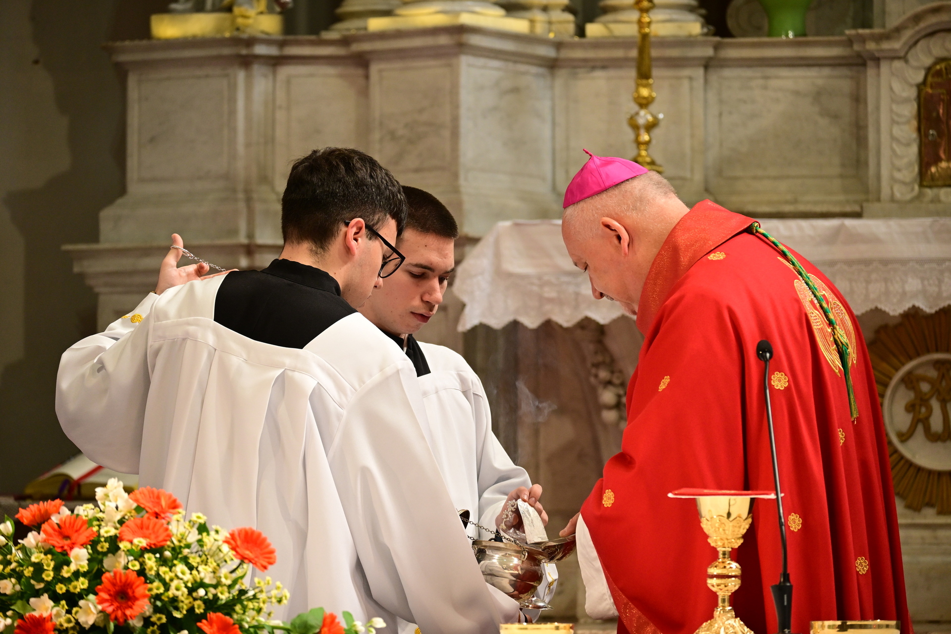 Poslije kratke okrjepe, s početkom u 10 sati, započelo je svečano pontifikalno misno slavlje u krčkoj prvostolnici koje je predvodio krčki biskup mons. Ivica Petanjak, u koncelebraciji sa rektorom preč. Matijom Pavlakovićem, duhovnikom sjemeništaraca vlč. Matkom Filipovićem i katedralnim župnikom don Vedranom Kirinčićem. Prigodnu homiliju unutar slavlja za okupljene hodočasnike izrekao je krčki biskup Petanjak, a nakon svete mise biskup je okupljene upoznao s bogatom poviješću grada Krka i same katedrale te je ukratko predstavio povjerenu mu biskupiju kojoj predsjeda u službi pastira. Nakon zajedničke molitve na grobu sluge Božjega biskupa Antuna Mahnića, hodočasnici su imali prigodu i za kratku okrjepu u prostorima biskupskog ordinarijata.