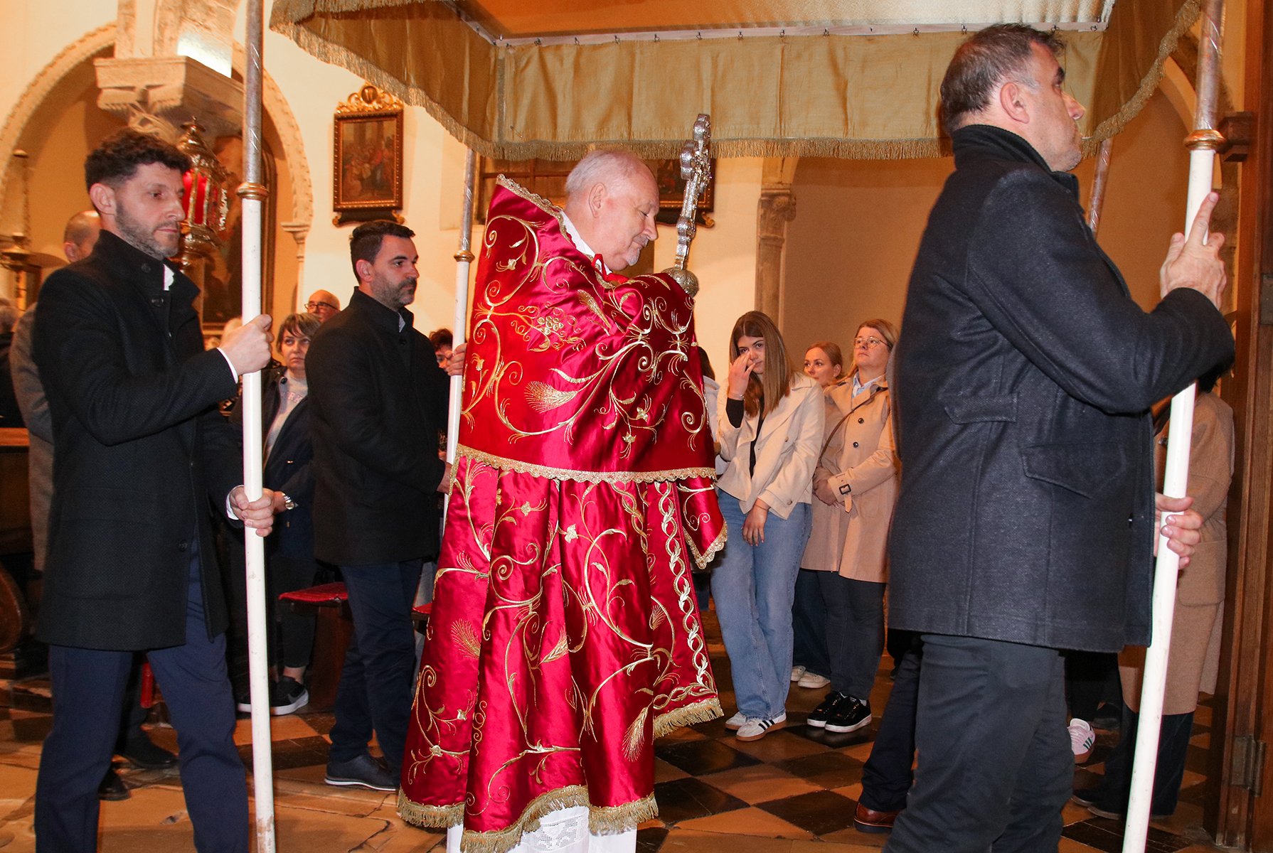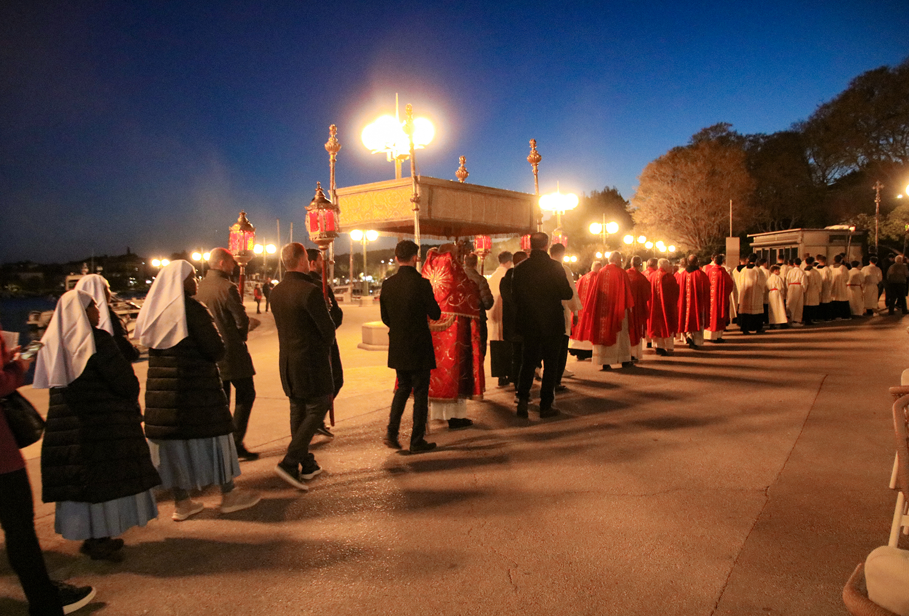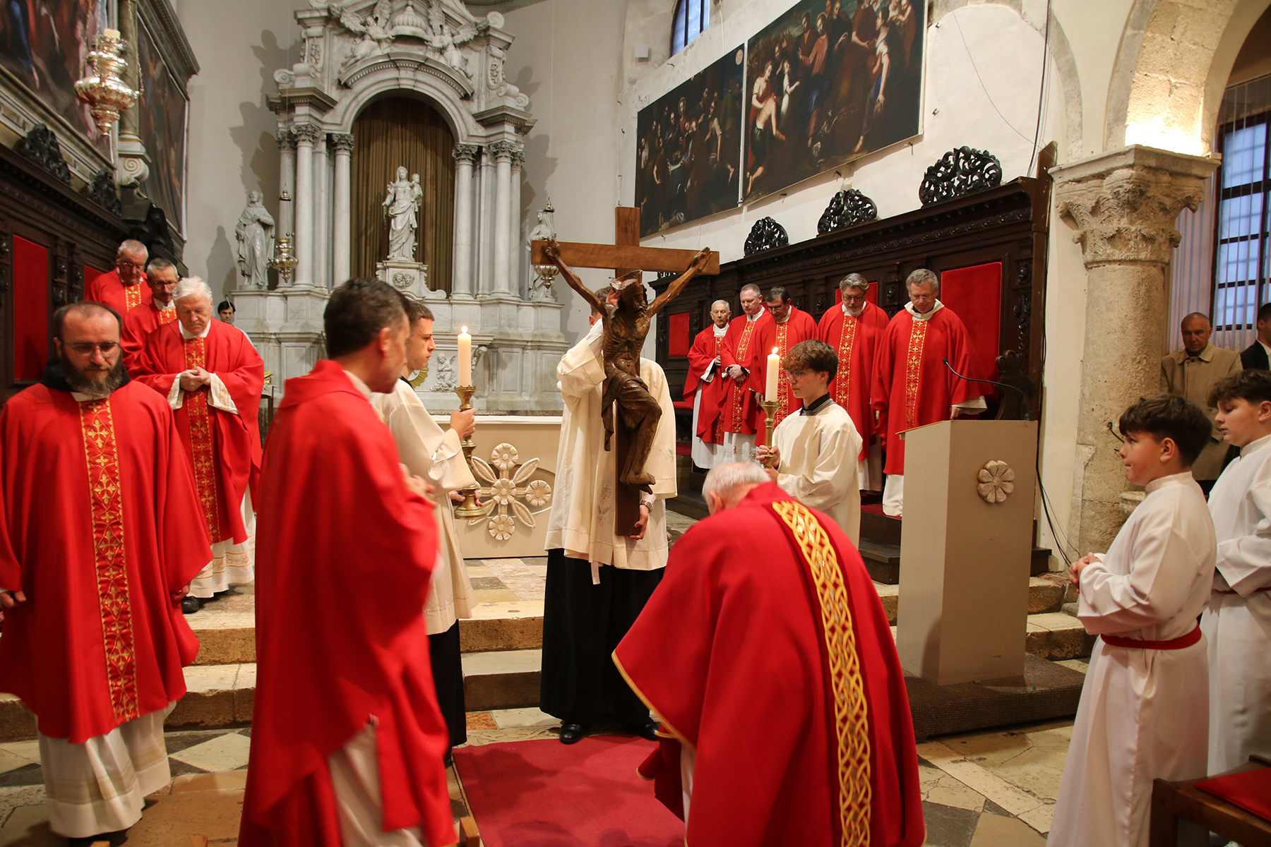 Uslijedilo je otkrivanje križa i klanjanje križu, a zatim su se vjernici, predvođeni biskupom i svećenicima, uputili na procesiju kroz grad s moćima svetog Križa.