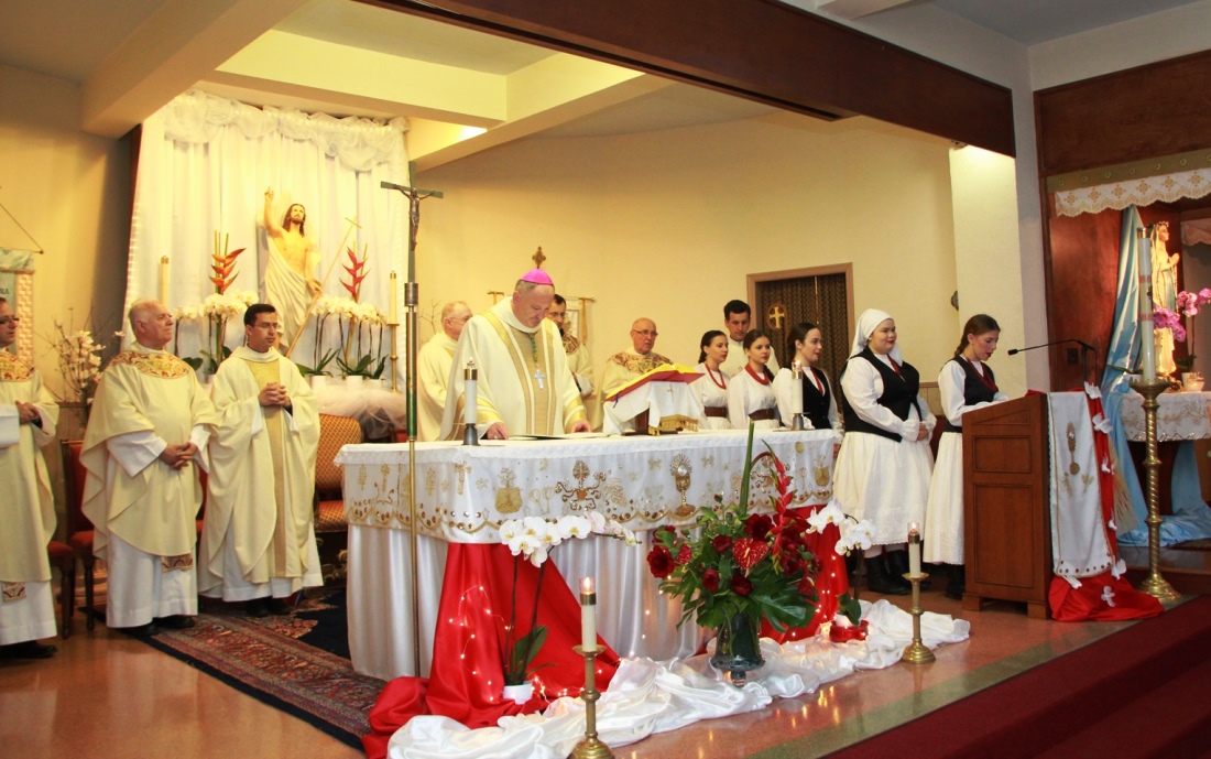 Proslava je, kako to dolikuje, započela procesijom i svečanom svetom Misom. Za oltarom, Misu su zajedno s biskupom Ivicom Petanjkom služili bivši voditelji Misije vlč. Anton Zec, vlč. Robert Zubović i vlč. Giordano Belanich, ali i župnik susjedne hrvatske župe Sv. Ćirila i Metoda na Manhattnu fra Nikola Pašalić, župnik župe Most Precious Blood vlč. William Krlis te vlč. Saša Ilijić, tajnik biskupa Petanjka. Naravno, sve pod budnim okom sadašnjeg voditelja Misije vlč. Vedrana Kirinčića. Tijekom Mise biskup Ivica Petanjak podijelio je sakrament Svete Potvrde petorici krizmanika. Misa je završila otkrivenjem kipa blaženog Ivana Merza koji će trajno krasiti okupljalište hrvatskih vjernika u Astoriji, donju crkvu župe Most Precious Blood. Najmlađi članovi Zajednice otpjevali su himnu „Put k suncu“ blaženom Ivanu Merzu.