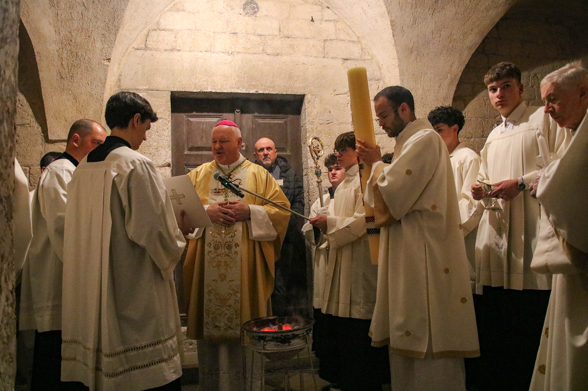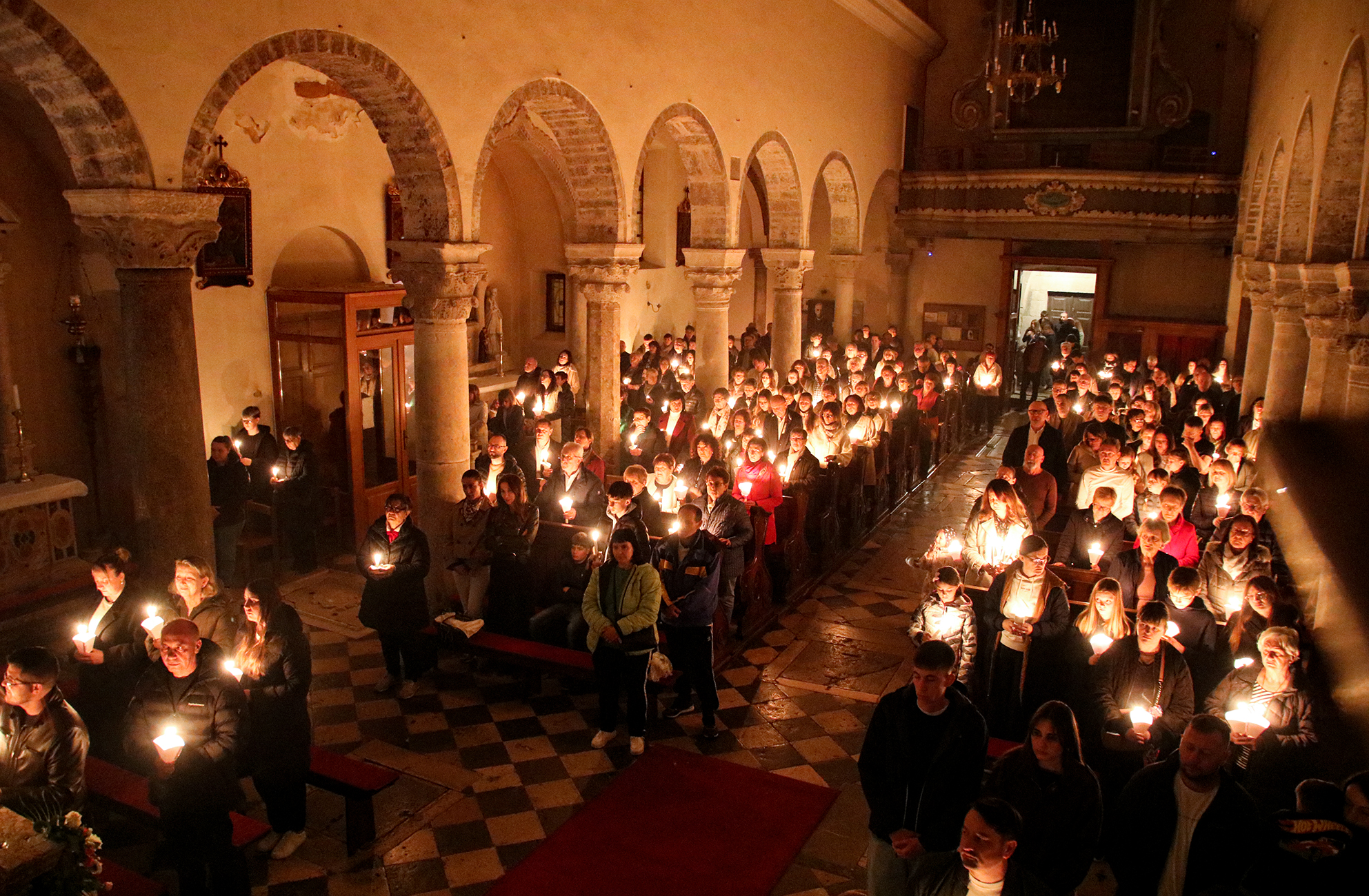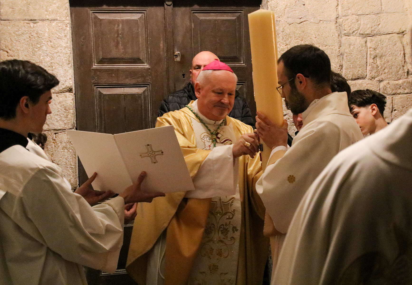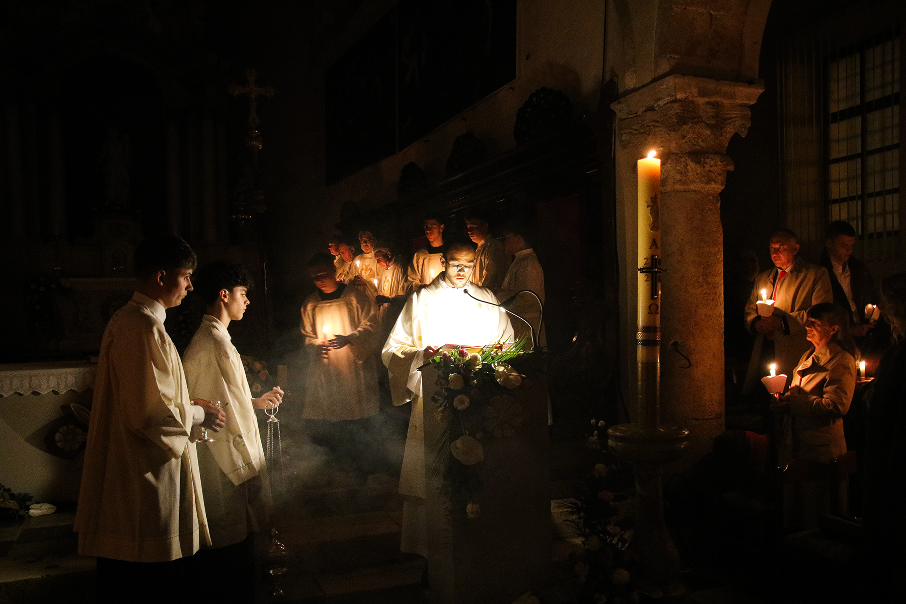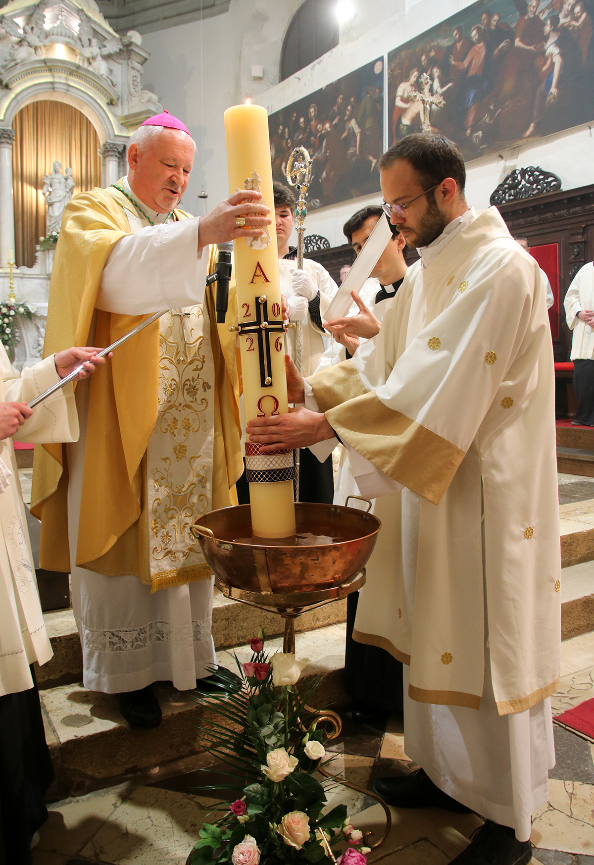 Mons. Ivica Petanjak predvodio je svečanu liturgiju Vazmenog bdjenja u Krčkoj katedrali. Liturgija je započela Službom svjetla u kojoj je blagoslovljen oganj pred vratima katedrale te s 5 rana Kristovih urešena Uskrsna svijeća koja je zatim unesena u procesiji u katedralu i čiji je plamen podijeljen okupljenim vjernicima. Hvalospjev Uskrsnoj svijeći otpjevao je đakon Marko Mikić, nakon čega je uslijedila Služba riječi.