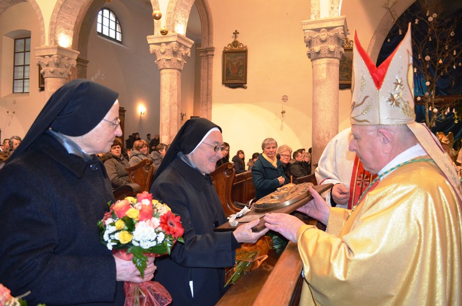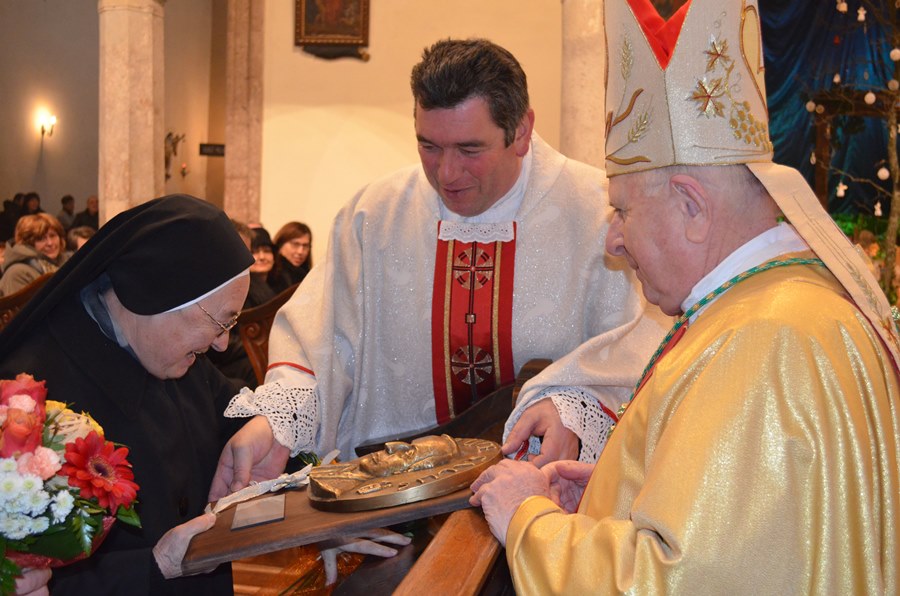Riječi zahvale sestrama je zatim uputio i krčki biskup. Zahvalio im je posebno za njihovu požrtvovnost i predanost službi u Biskupskom dvoru. Četiri sestre koje se trenutno nalaze u Krku primile su zatim bukete cvijeća i plaketu s likom biskupa Mahnića. Sestrama sv. Križa, Biskup je poželio da im sluga Božji biskup Antun Mahnić, čije je geslo „U križu je spas“, uvijek bude zagovornikom. Zbor je zatim otpjevao „In cruce salus“ sluge Božjega Ivana Perana.